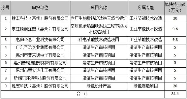 据公示附件“2021年惠阳区节能专项资金项目拟安排表”内容,获得嘉奖的项目共有三个专题类别,分别为:工业节能技术改造、清洁生产审核项目和绿色制造项目,分别有3项目、5项目和1项目。其中ky开元科技(惠州)股份有限公司的老厂生物质锅炉汰换天然气锅炉,东江精创注塑(惠州)有限公司的空压机余热回收系统工程节能技术改造项目等3项目为工业节能技术改造;ky开元科技(惠州)股份有限公司的绿色设计产品为绿色制造项目;惠州普瑞康建筑材料有限公司、广东至远实业集团有限公司等5企业的清洁生产审核项目为清洁生产审核项目。